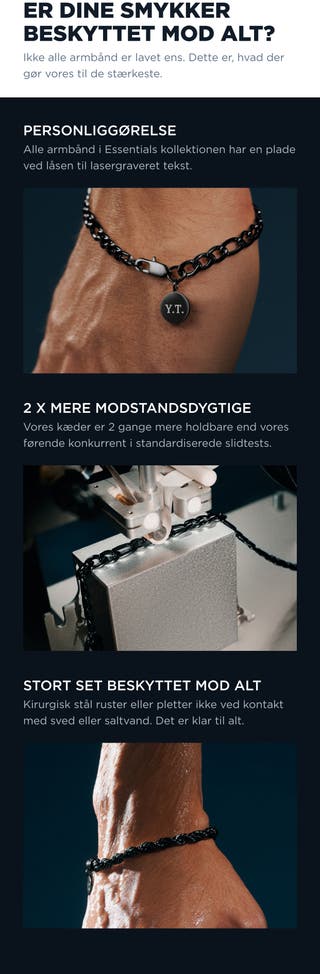 Dette armbånd har en slank, sort kæde i 316L rustfrit stål, der giver et rent og diskret look. Metallet er nikkelfrit, så det ligger behageligt mod huden. Den mørke overflade bevarer et afdæmpet, moderne udtryk. En lille rund plade ved låsen giver en pæn, diskret detalje.