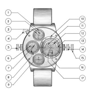 Indstil tiden for urskive 2 (praktisk til en anden tidszone): Flyt krone B til position 5 og drej.