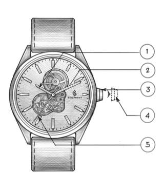 Optrækning af uret manuelt: Flyt kronen til 3. position og drej med uret. Foretag kun 1-5 hele rotationer, eller indtil du mærker let modstand, ellers kan du risikere at ødelægge bevægelsen.